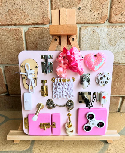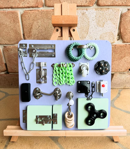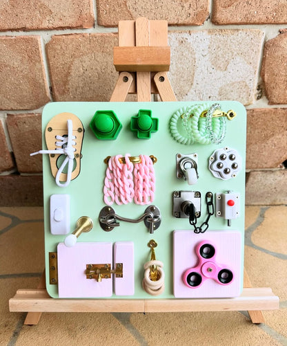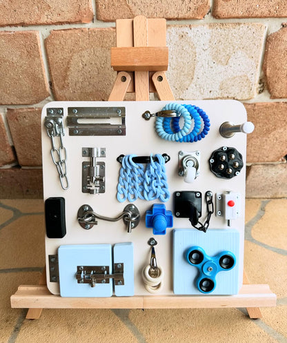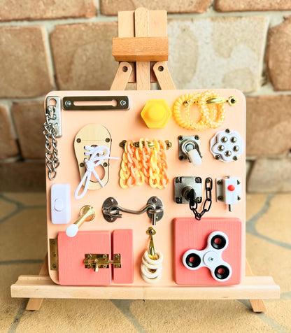 Montessori busy board with 10+ sensory activities for toddlers 6 months and above. Develops fine motor skills, perfect travel toy for quiet independent play.